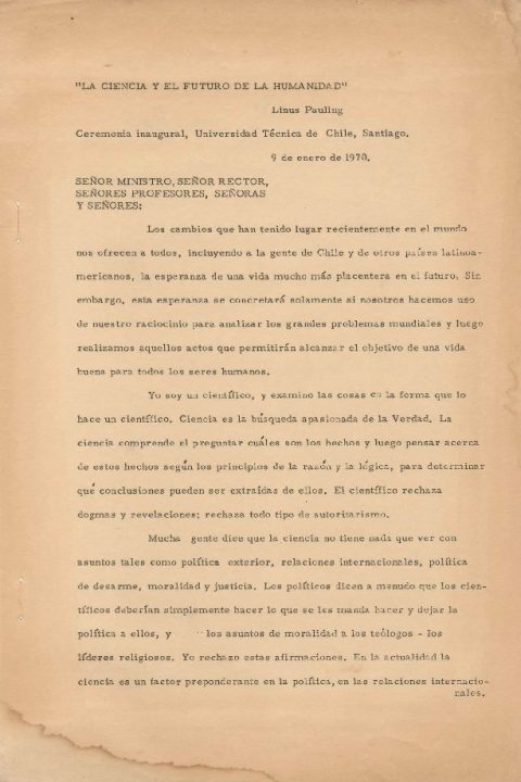 Discurso de Linus Pauling "La ciencia y el futuro de la humanidad" Ceremonia inaugural, Universidad Técnica de Chile, Santiago.