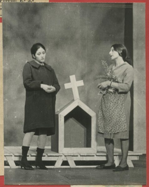 Sonia Viveros y Maité Fernández en escena de la obra "Homo chilensis" de María Asunción Requena, estrenada por el Teatro Teknso en 1972 bajo la dirección de Raúl Rivera.