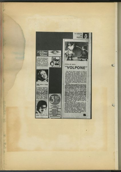 El documento corresponde a recortes de prensa de "Las noticias de última hora" y "3era de la hora". Las notas abordan la presentación de la obra Volpone de Ben Jonson, estrenada por el Teatro Teknos en mayo de 1973. Una de las características fundamentales del grupo teatral de la UTE, fue su intensa labor de difusión artístico cultural, llevando obras de teatro a ciudades a lo largo de todo Chile y parte de Latinoamérica, pueblos, poblaciones, sindicatos y escuelas. Es por esto que para la difusión del teatro clásico, el director Raúl Rivera realizó adaptaciones de las obras en un lenguaje más cercano al público al que apuntaban, pero sin alterar su contenido.