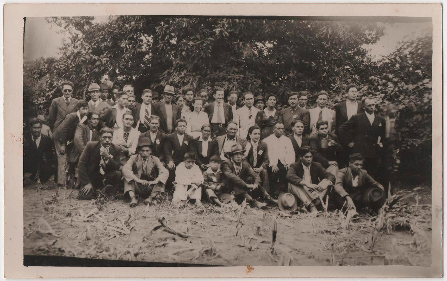 Fotografía grupal de hombres y mujeres junto a Enrique Kirberg B. Posiblemente este registro correspondió a la época en que Kirberg fue enviado a la ciudad de Chillán tras el terremoto ocurrido en enero de 1939, por el Comité Central del Partido Comunista. Kirberg asumió el cargo de Secretario Regional en dicho partido trasladándose a la región de Ñuble. Su misión se centró en apoyar la reconstrucción de la ciudad, y en la creación de nuevas células partidarias, organizando a los obreros y campesinos del sector. Mientras estuvo como encargado realizó diversas actividades y campañas como, por ejemplo, la campaña contra el alcoholismo.