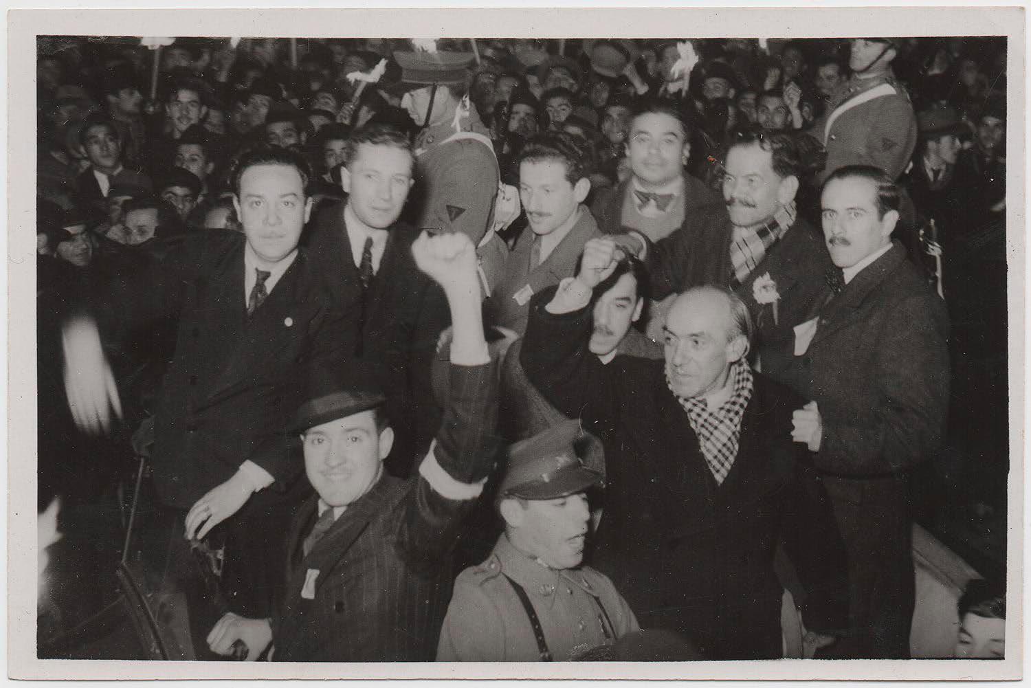 La imagen corresponde a una celebración espontánea relacionada con la candidatura presidencial o elección de Pedro Aguirre Cerda. Destacan en ella Enrique Kirberg junto a dicho candidato/Presidente. Kirberg fue partícipe de la campaña presidencial durante su estadía en la ciudad de Talca. Desde allí organizó las bases del Partido Comunista en la zona y apoyo firmemente la reconstrucción de la ciudad después del terremoto de 1939.