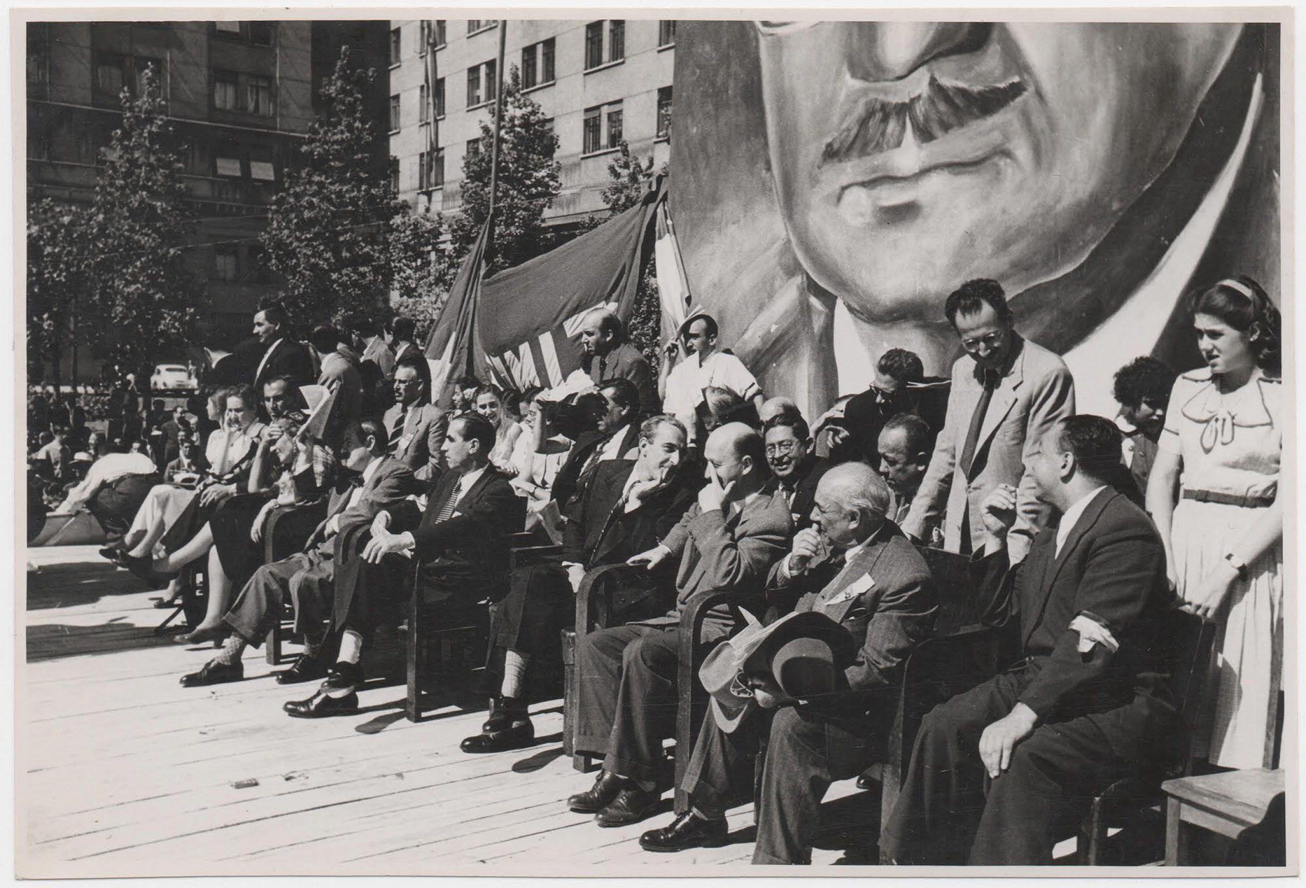 En la fotografía, sobre el escenario de pie Enrique Kirberg, junto a él diversas personalidades entre las que destaca Volodia Teitelboim miembro del Partido Comunista de Chile. Según la información recopilada, se estima que la imagen correspondería a la campaña presidencial de Salvador Allende de 1952, donde Enrique Kirberg participó como Secretario de Organización de campaña a nivel nacional. Si bien fue participe en las campañas posteriores de Allende, fue la de 1952 donde tuvo un rol más activo y desatacado, asumiendo responsabilidades como miembro del PCCh.