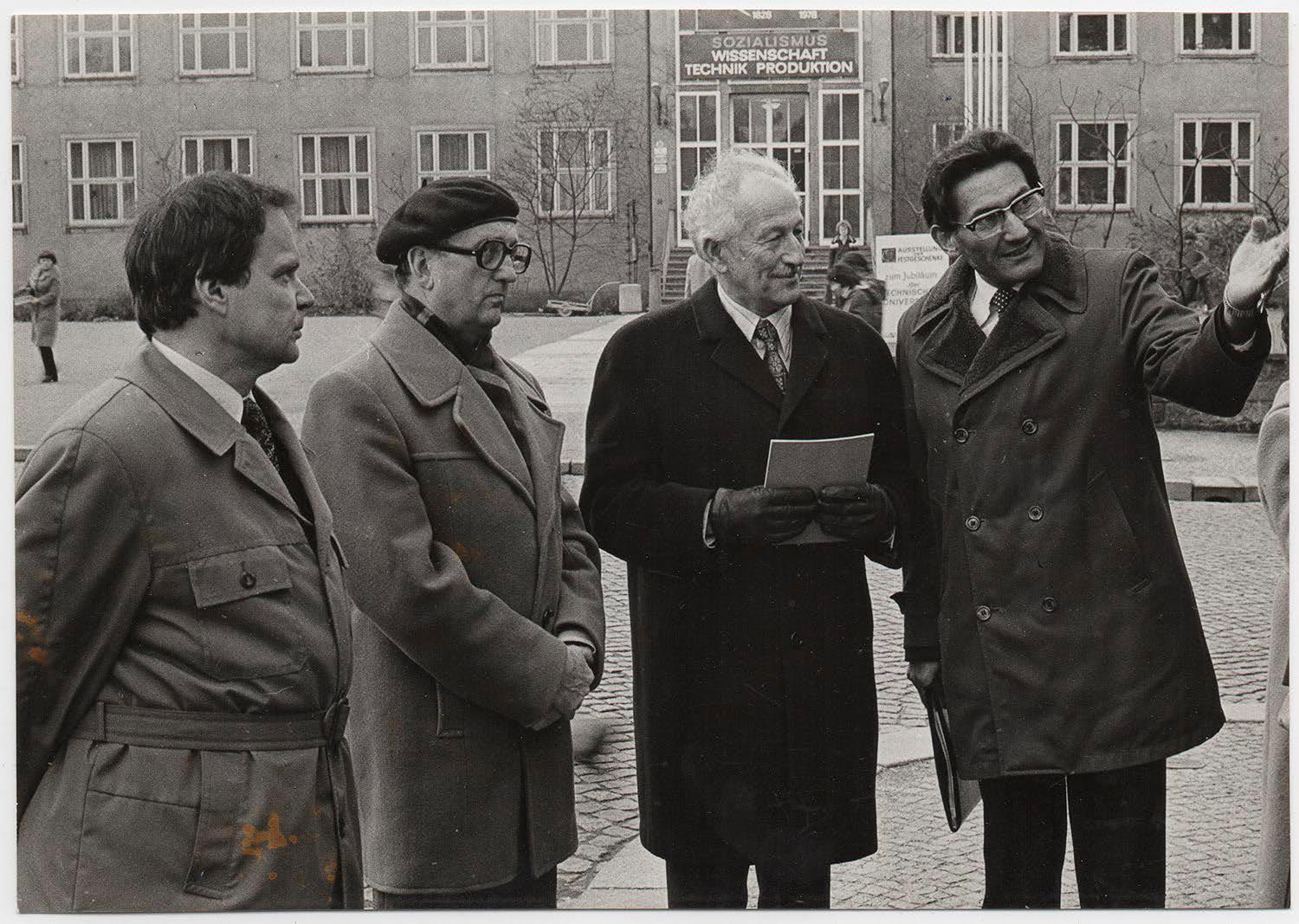 En 1978 encontrándose exiliado en EE.UU, Enrique Kirberg viajó a Alemania y Bélgica donde dio conferencias en universidades. Posiblemente la imágen corresponda a la visita hecha a la Universidad Técnica de Dresden, donde dio una conferencia. La Universidad Técnica de Dresden había establecido un convenio con la UTE desde 1966, que consistía en un programa de intercambio para actividades de investigación en donde un equipo de 3 o 4 profesores de la universidad alemana desarrollaban actividades de investigación en la UTE junto a estudiantes, lo que favoreció al sistema de investigación en cuanto a métodos, procedimientos y sugerencias en la dotación de laboratorios; a la vez que un profesor de lengua alemana preparaba a cuatro estudiantes de la UTE para ser becados en Dresden.