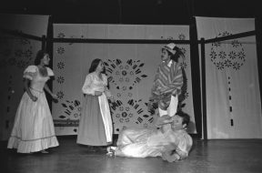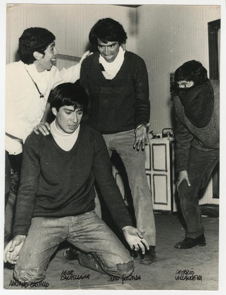 Adriano Castillo, Igor Cantillana, Juan Quezada y Patricio Villanueva en escena de la obra "El pequeño Malcom y su lucha contra los eunucos" del autor David Halliwell, montada por el Teatro Teknos en 1967, bajo la dirección de Raúl Rivera. Con el fin promocionar esta obra, los actores del Teknos ampliaron los límites del escenario y salieron a las calles de Santiago con carteles del Partido Ereccionista Dinámico (PED), agrupación que aparece en la obra.