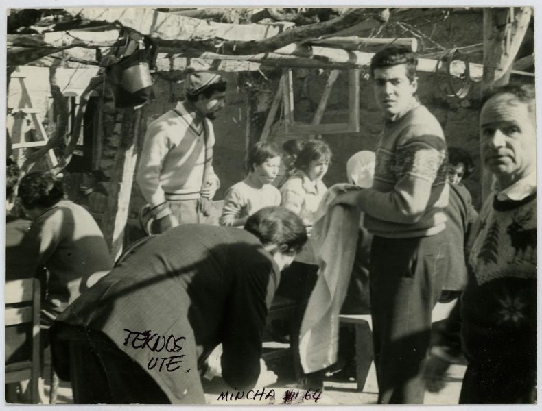 Parte del equipo del Teatro Teknos compartiendo en una visita realizada en 1964 a Mincha, localidad de la comuna de Canela, Provincia de Choapa, Región de Coquimbo. Una de las labores que caracterizó a la compañía teatral de la UTE fue la extensión, visitando diferentes regiones y sedes de la Universidad desde sus primeros años de existencia, giras que hacia fines de la década de 1960 se ampliaron a lo largo de Chile e incluso a otros países latinoamericanos.