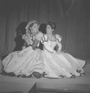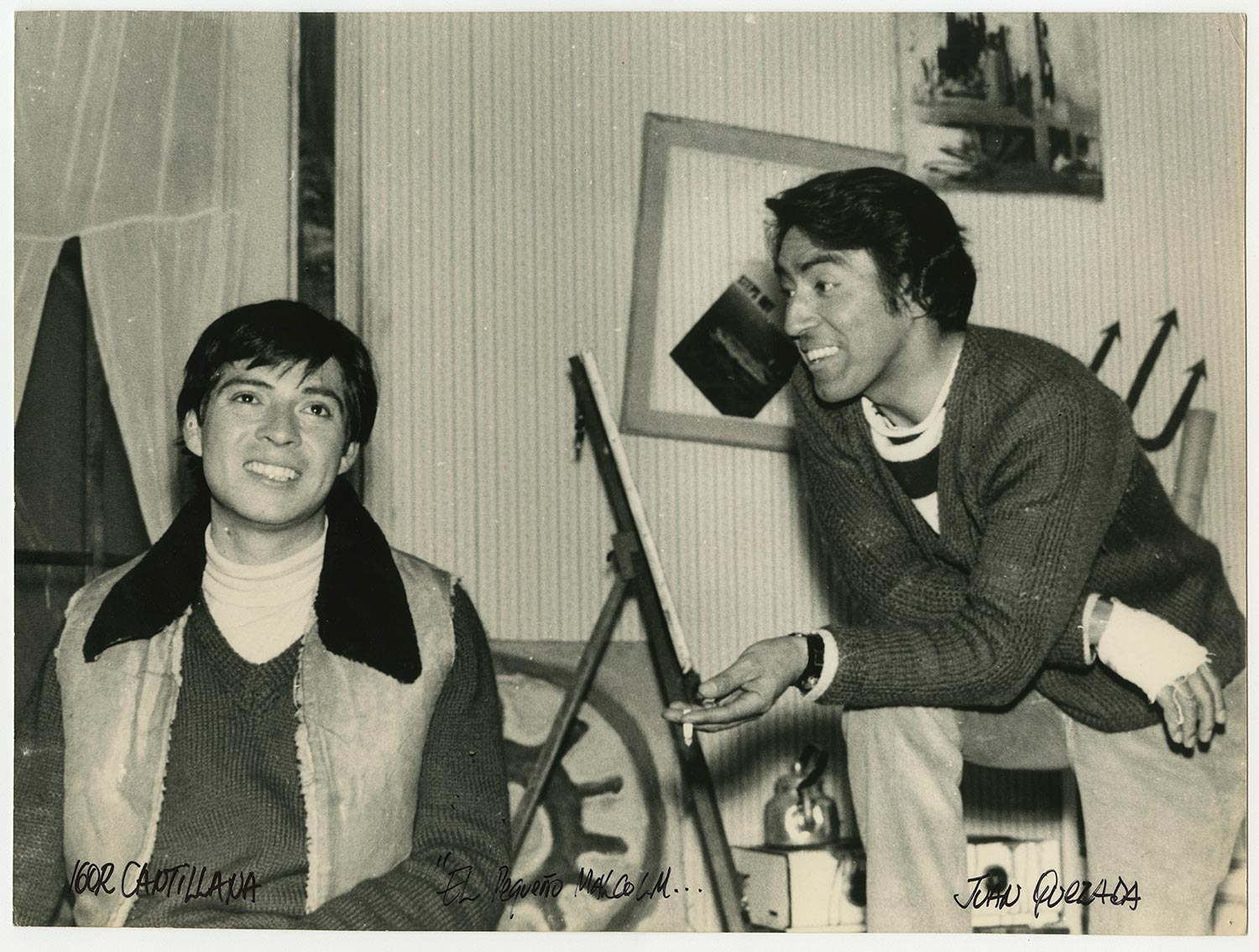 Juan Quezada e Igor Cantillana en escena de la obra "El pequeño Malcolm y su lucha contra los eunucos" del dramaturgo inglés David Halliwel, estrenada por el Teknos en 1967. Esta fue promocionada en las calles del centro de Santiago, mediante una intervención con pancartas del "Partido Ereccionista Dinámico", agrupación que aparece en la obra.