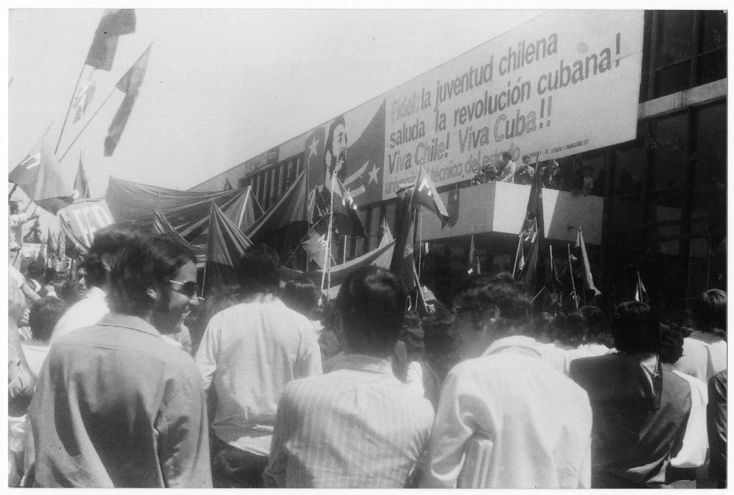 Concentración de estudiantes con motivo de la visita del Primer Ministro y Presidente de Cuba, Comandante Fidel Castro Ruz. Castro visitó la Universidad Técnica del Estado el 29 de noviembre de 1971, siendo recibido por toda la comunidad universitaria encabezada por el rector Enrique Kirberg pero principalmente por los estudiantes. En el país hace un año se había iniciado el gobierno de la Unidad Popular liderado por el Presidente Salvador Allende, y se estaban realizando importantes transformaciones sociales, culturales y políticas con el objetivo de avanzar hacia un socialismo por la vía democrática. Los jóvenes de izquierda fueron protagonistas de estos cambios, y miraron el proceso cubano con admiración y como un ejemplo a seguir respetando las diferencias específicas que se daban en cada espacio.
