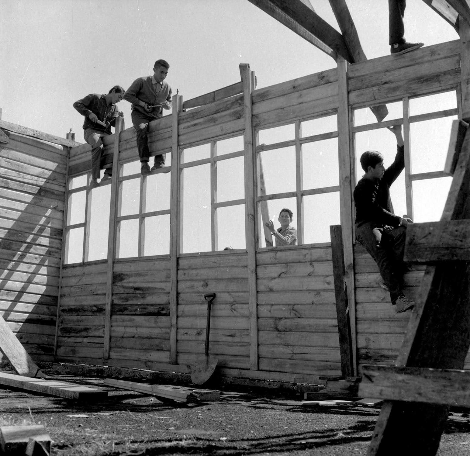 Estudiantes UTE construyendo una escuela rural en el sur de Chile en el marco de los trabajos voluntarios organizados por la FEUT en la zona de Butuco, Chacaico, Traulemu, Manzanares, Santa Julia, Queuque y Tolpán localidades de la provincia de Malleco, donde además de trabajar en faenas de construcción, los estudiantes organizaron centros de madres entre otras actividades de extensión.