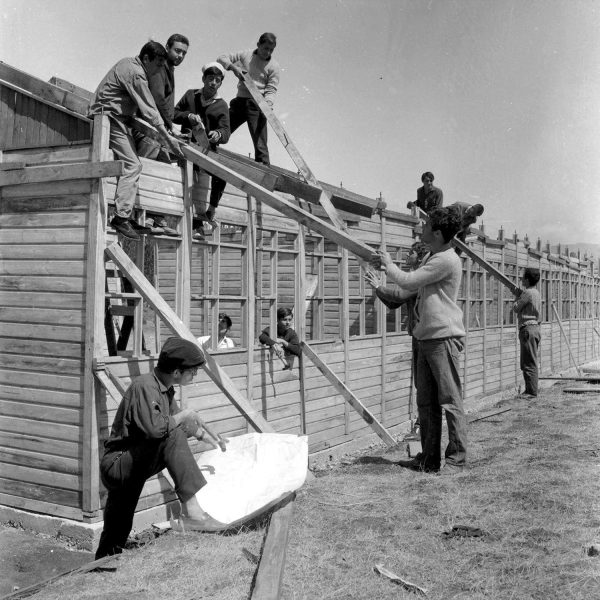 Estudiantes UTE construyendo una escuela rural en el sur de Chile en el marco de los trabajos voluntarios organizados por la FEUT en la zona de Butuco, Chacaico, Traulemu, Manzanares, Santa Julia, Queuque y Tolpán, localidades de la provincia de Malleco donde además de trabajar en faenas de construcción, los estudiantes organizaron centros de madres entre otras actividades de extensión.