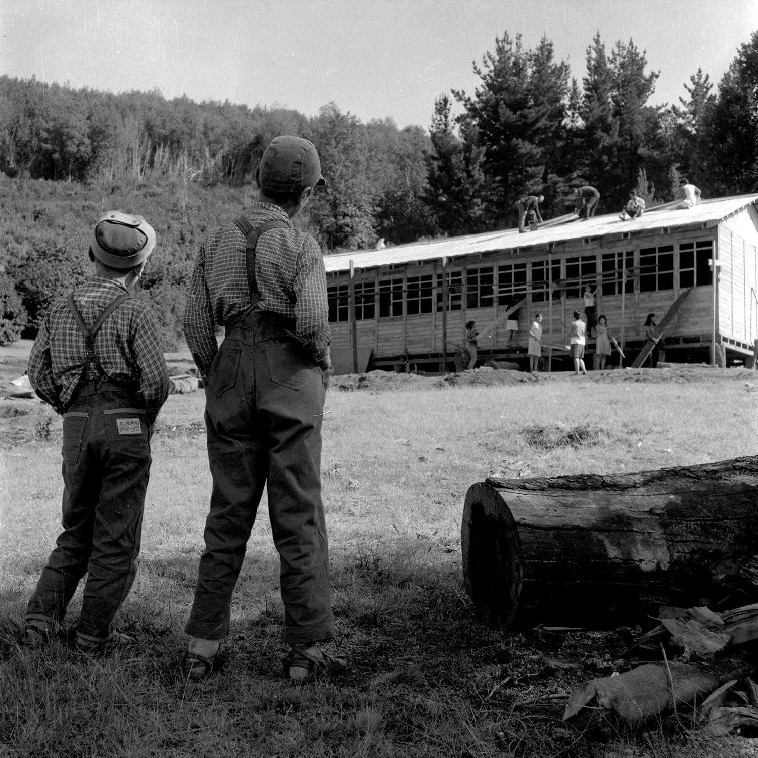 Niños de la zona observando su nueva escuela, construida por estudiantes de la UTE en el marco de los trabajos voluntarios organizados por la FEUT en la zona de Butuco, Chacaico, Traulemu, Manzanares, Santa Julia, Queuque y Tolpán . Los trabajos voluntarios fueron una importante herramienta de concientización y crecimiento para el movimiento estudiantil que lideraba la Reforma universitaria; con ellos, miles de estudiantes pudieron no sólo conocer la realidad nacional de muchos sectores sociales postergados, sino que también valoraron la importancia de la organización de base.