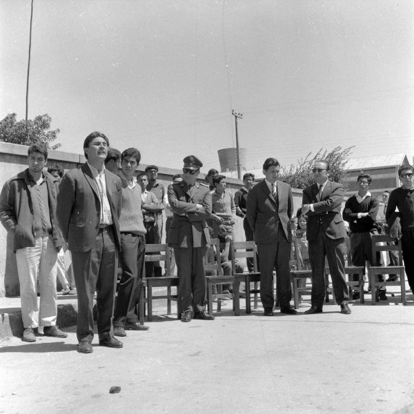 Alejandro Yáñez, presidente de la FEUT, en la presentación del mural pintado por los estudiantes de la Universidad Técnica del Estado fuera de la estación de Angol, en el marco de los Trabajos Voluntarios de 1966.