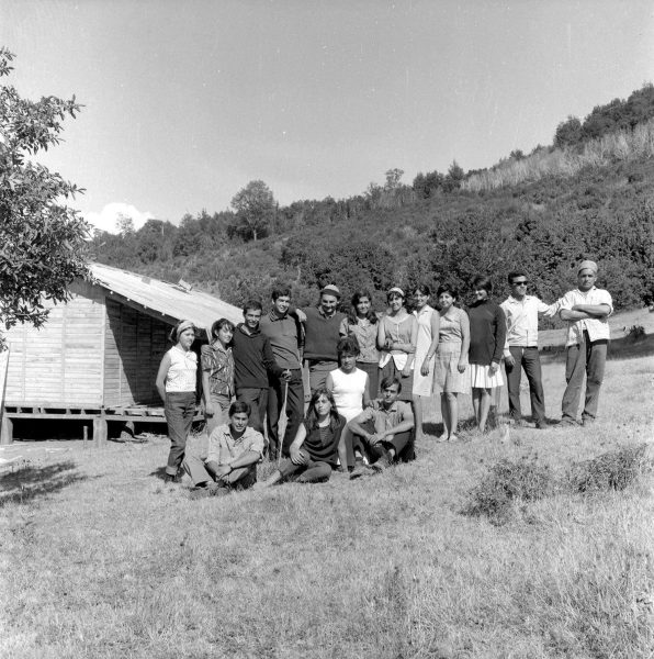 Estudiantes de la Universidad Técnica del Estado en la localidad de Santa Julia durante los Trabajos Voluntarios de verano en 1966, construyendo una escuela de dos aulas a la cual sólo faltó instalar el piso por falta de materiales. A la izquierda, de frente, el histórico presidente de la Federación de Estudiantes, Alejandro Yáñez, quien ejerció el cargo entre los años 1966-1967 y 1969 -1970.