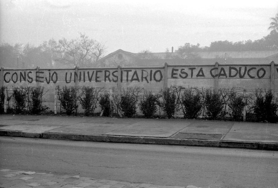 Fotografía que refleja parte de lo que fue el proceso de reforma universitaria encabezado por los estudiantes de la UTE durante la década del sesenta. Este movimiento fue liderado por la FEUT, y desde sus incicios en 1961 cuestionó profundamente los mecanismos anacrónicos y anti democráticos ejercidos por la institución sobre todo para elegir a las máximas autoridades. Por ello, el movimiento reformista tuvo como objetivo transformar a esta universidad en un espacio democrático, moderno y conectado con las necesidades del país.