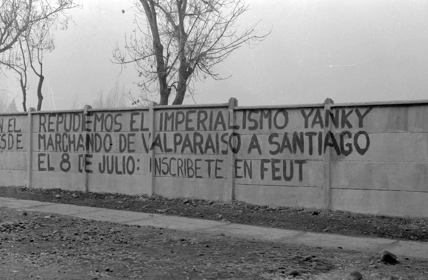 Archivo fotográfico que muestra consignas de los estudiantes de la UTE inmersos en la reforma universitaria. Este proceso abarcó todos los aspectos de la vida de los jóvenes quienes fueron parte de una generación que rompió con las viejas estructuras y paradigmas de la sociedad. Fue un movimiento amplio que se identificó con las grandes luchas de libertad y solidaridad de los pueblo oprimidos. La FEUT fue la organización de los estudiantes que lideró este proceso en la UTE fomentando la participación y las ideas de cambios en los estudiantes quienes en 1967 lograron posicionar las ideas reformistas tras realizar una toma de la Casas Central que marcó el inicio de este proceso con el apoyo de gran parte de los académicos y el liderazgo del futuro rector por la reforma Enrique Kirberg.