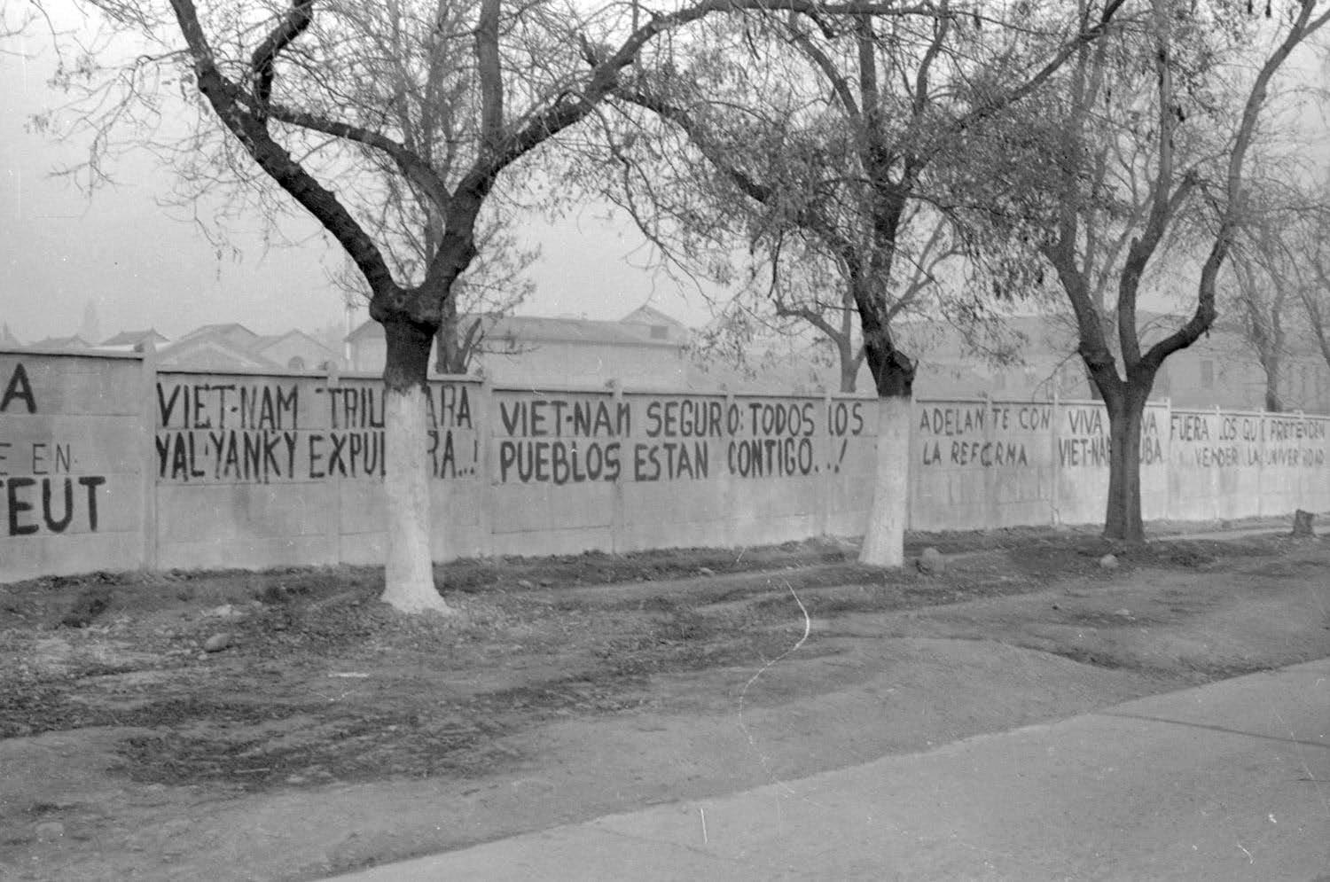 Fotografía que muestra el contexto de lo que fue la reforma universitaria en la UTE durante la década de los sesenta. Los rayados en murallas fueron parte de las manifestaciones de los estudiantes en este proceso. En septiembre 1967 la FEUT que encabezó este movimiento, se tomó la Casa Central de la universidad pues los estudiantes exigieron que el rector se eligiese democráticamente. El trasfondo de estas acciones decían relación con la necesidad de transformar a esta institución en un espacio verdaderamente democrático y al servicio de las necesidades del pueblo, principalmente de los trabajadores.