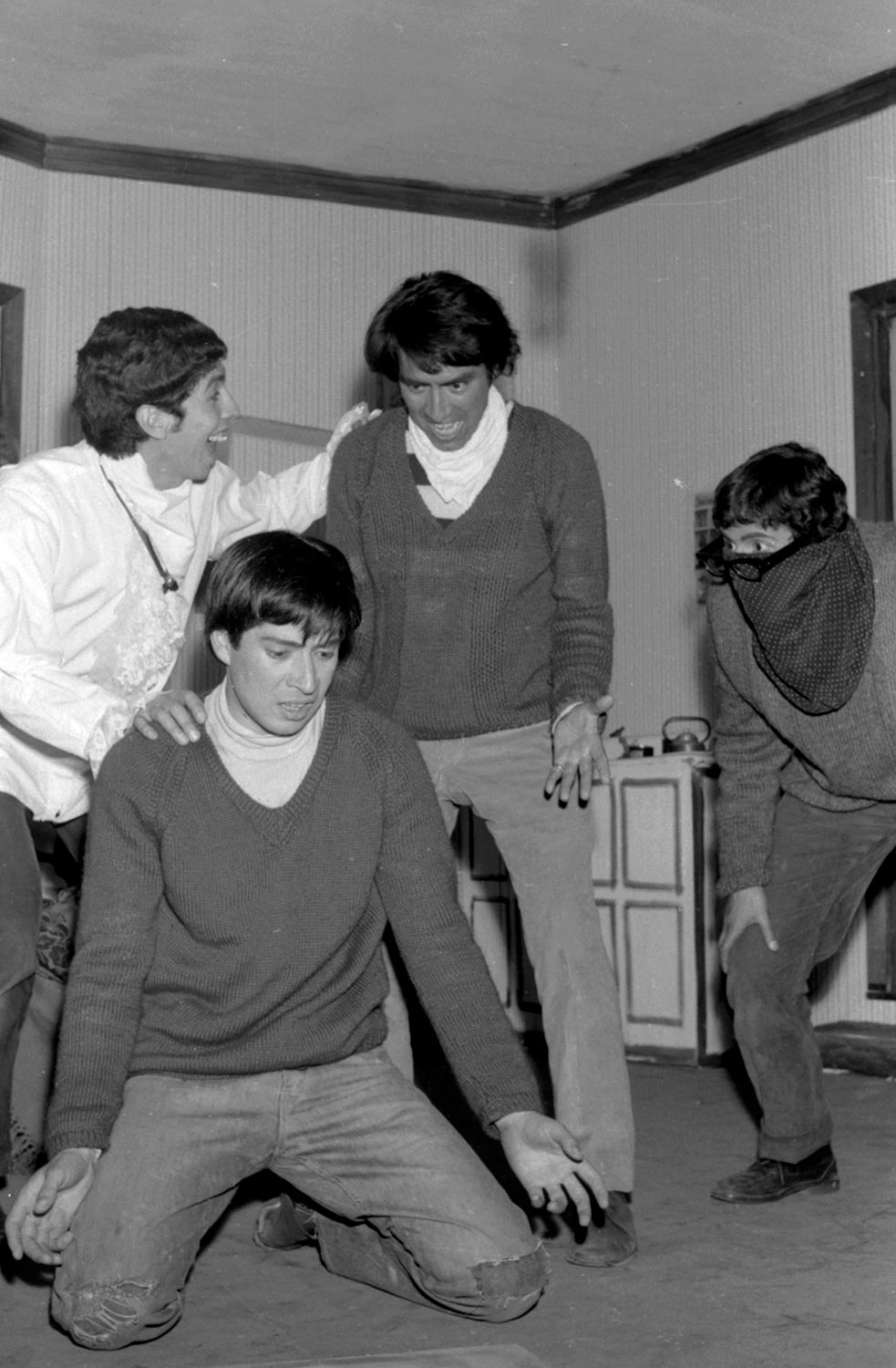 "El pequeño Malcom y su lucha contra los eunucos" es una obra teatral del inglés David Halliwell, presentada por el Grupo Teknos en 1967. En la imagen, arriba, de derecha a izquierda: Adriano Castillo, Juan Quezada y Patricio Villanueva. Abajo: Igor Cantillana.