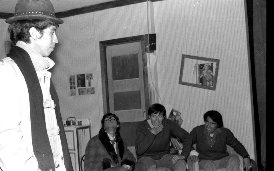 Escena de "El pequeño Malcom y su lucha contra contra los eunucos" del dramaturgo ingés David Halliwelll, que fue presentada por el Teatro Teknos en 1967, en la imagen, de izquierda a derecha, los actores Adriano Castillo, Patricio Villanueva, Igor Cantillana y Juan Quezada.