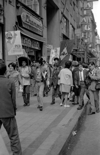 Actores del Teatro Teknos salieron a las calles de Santiago a promocionar la obra "El pequeño Malcolm y su lucha contra los eunucos" del dramaturgo inglés David Halliwell, con pancartas del PED "Partido Ereccionista Dinámico", agrupación que aparece en la obra teatral.