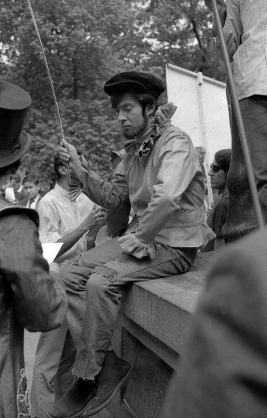 Igor Cantillana, actor del Teatro Teknos, promocionando en las calles de Santiago, la obra "El pequeño Malcolm y su lucha contra los eunucos" del dramaturgo inglés David Halliwell en 1968.