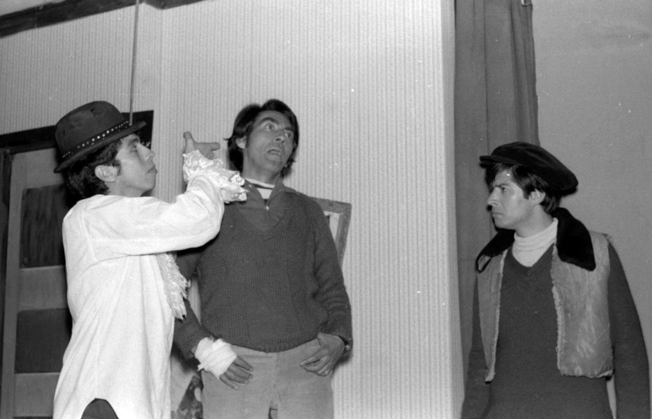 Adriano Castillo, Juan Quezada e Igor Cantillana en escena de la obra "El pequeño Malcolm y su lucha contra los eunucos" del dramaturgo inglés David Halliwell, presentada por el Teatro Teknos en 1967.