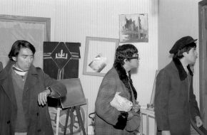 En el centro de la imagén se aprecia a: Héctor Torres, Director de la Escuela de Artes y Oficios; Carlos Ibáñez del Campo, Presidente de la República y Santiago Labarca, rector UTE recorriendo la Exposición Industrial Internacional.
