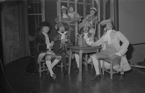 La Exposición Industrial Internacional de 1958 fue organizada por la Universidad Técnica del Estado y se realizó en dependencias de la Escuela de Artes y Oficios. Destacan en la imagen: Santiago Labarca, rector UTE ; Diego Barros, Ministro de Educación y Carlos Ibáñez del Campo, Presidente de la República