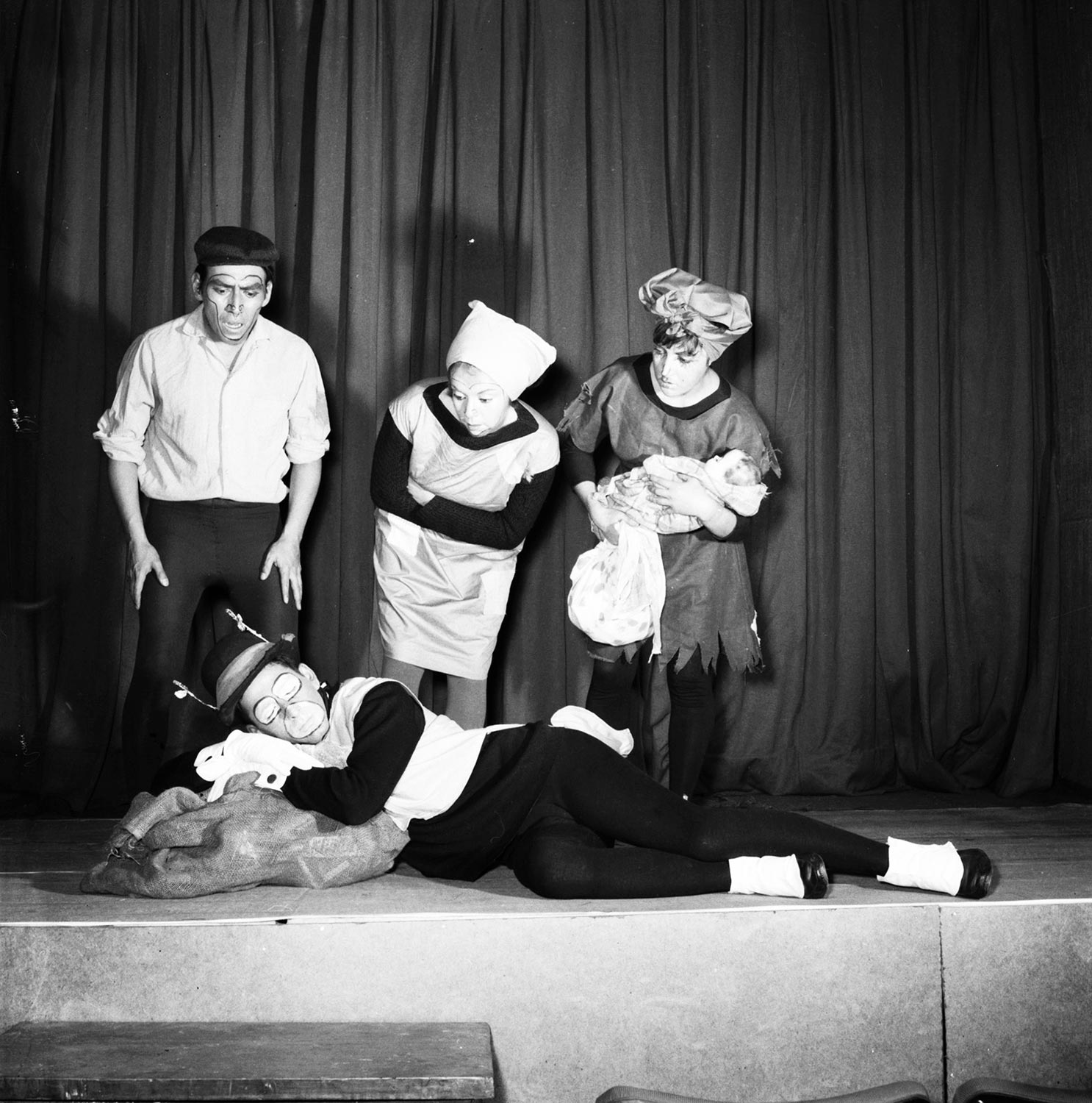 Escena de "Los grillos sordos", obra para niños del autor y director Jaime Silva, que fue montada por el Teatro Teknos en 1964. Con esta obra, Teknos obtuvo el Segundo Premio de Teatro Infantil en el Festival de Teatro Aficionado de Viña del Mar.