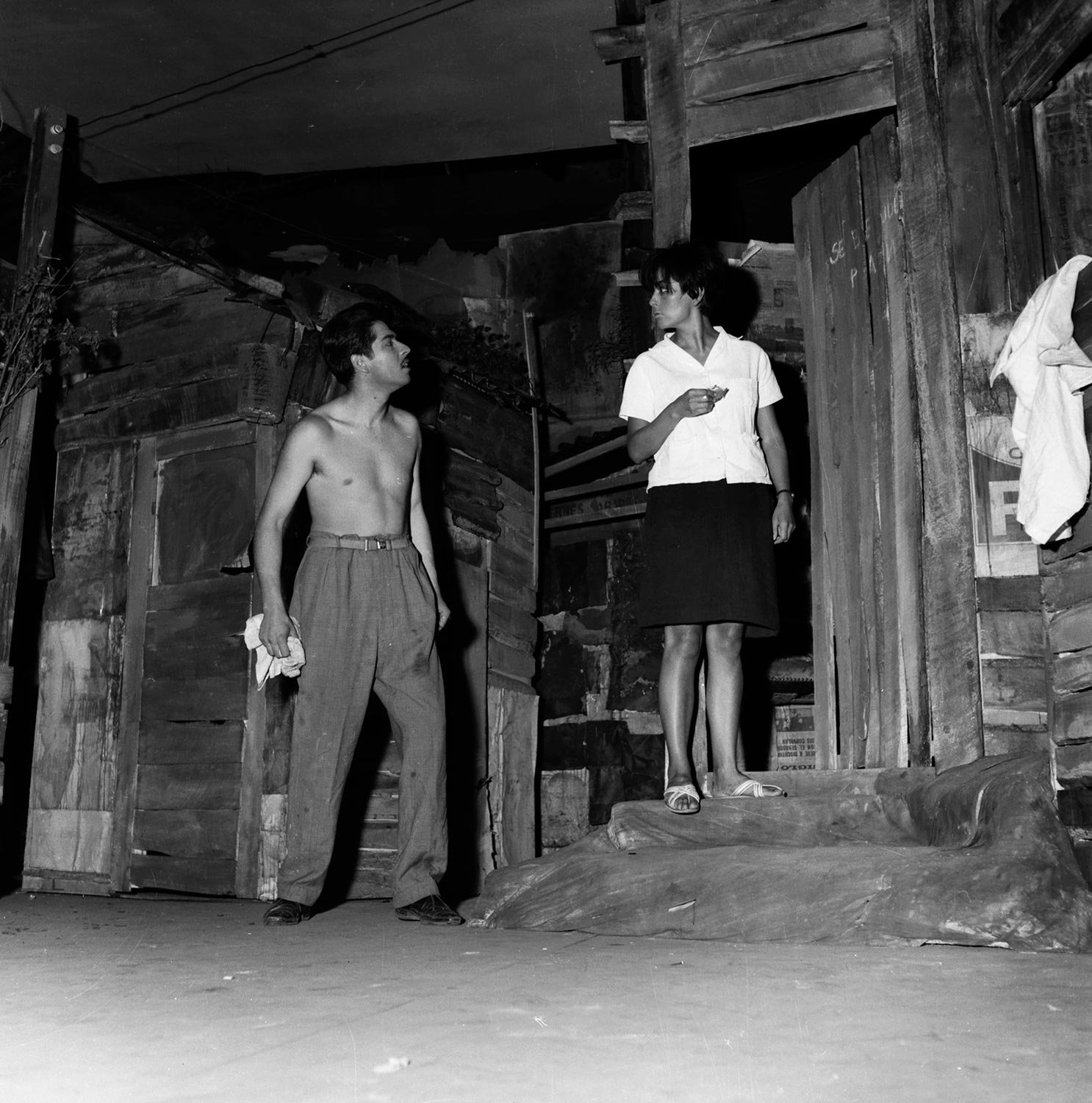 Ensayo de la obra teatral "Pan caliente" de la autora chilena María Asunción Requena, que fue presentada por el Teatro Teknos en el año 1967, siendo una de las obras más exitosas del grupo, con más de 600 presentaciones en Chile y el extranjero. En la imagen, los actores Igor Cantillana y Norma Vidal.