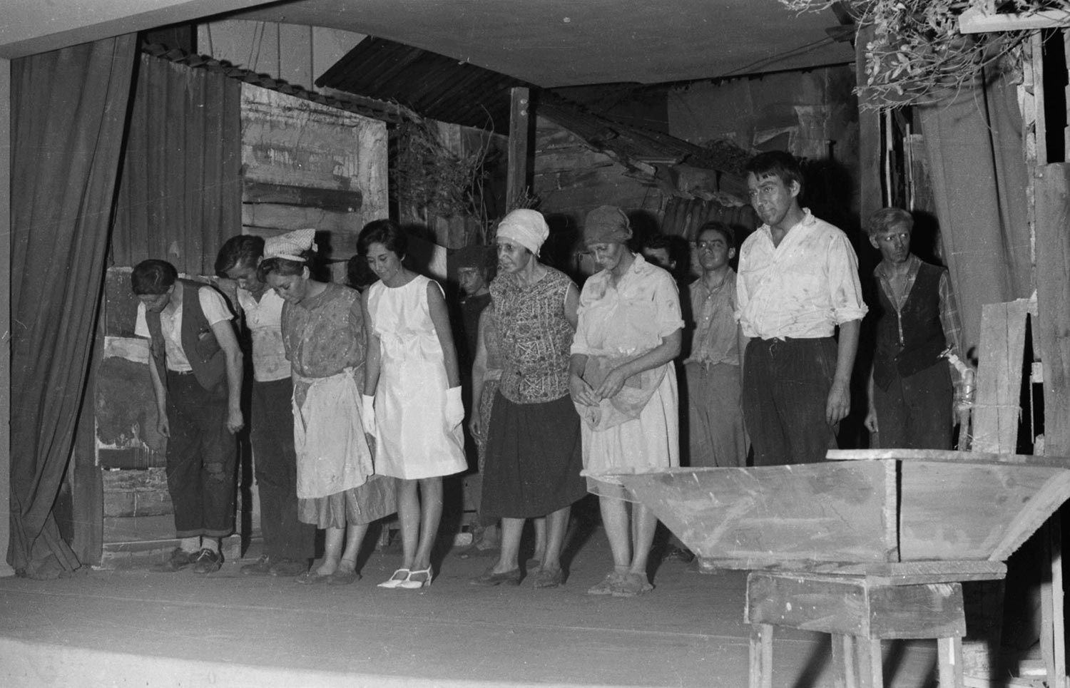 Función inaugural de la obra teatral "Pan caliente" de la autora chilena María Asunción Requena, que fue presentada por el Teatro Teknos en el año 1967, siendo una de las obras más exitosas del grupo, con más de 600 presentaciones en Chile y el extranjero. En la imagen Oscar Ripoll, Víctor Mix Gladys del Río, Norma Vidal, Clara Brevis, Maité Fernández y Juan Quezada.