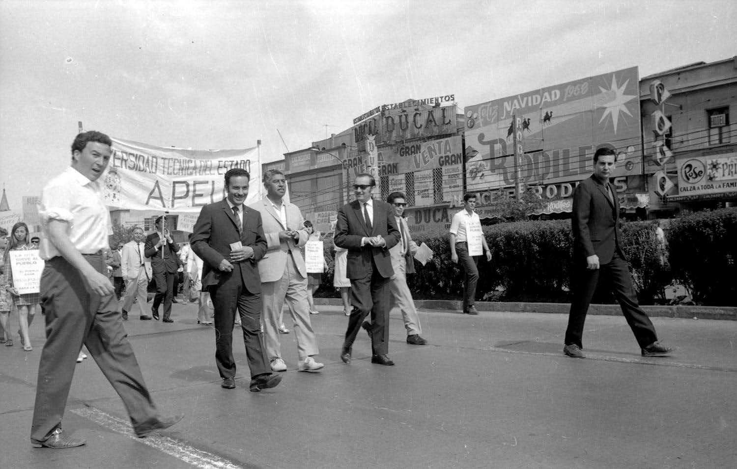 Al centro de la imagen, conversando con un carabinero, Tomás Ireland, Director del Departamento de Metalurgia de la EII. En 1970, Ireland fue electo por la comunidad universitaria como Secretario General.