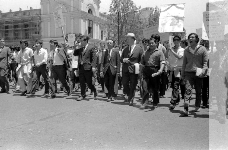 Senador comunista participando junto a los estudiantes, académicos, funcionarios y autoridades de la Universidad Técnica del Estado en una marcha por la Alameda, exigiendo mayor presupuesto para la universidad el 8 de noviembre de 1968.
