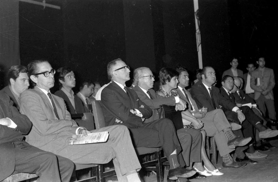 Senador Carlos Altamirano en el acto de clausura de la "Marcha del Presupuesto" realizado en el Teatro del Instituto de Extensión Musical de la Universidad de Chile (actual Cinearte Normandie) el 8 de noviembre de 1968. Carlos Altamirano fue Secretario General del Partido Socialista entre 1971 y 1979. Estuvo en la lista de los hombres más buscados por la dictadura militar, aislándose a pocos días del Golpe de Estado de 1973 en Cuba. Posteriormente vivió en la República Democrática Alemana.