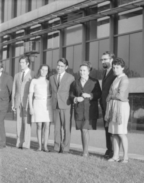 Igor Cantillana, Gabriela Medina, Juan Quezada, María Asunción Requena, Raúl Rivera y Maité Fernández en sesión fotográfica en los jardines de la Universidad Técnica del Estado, previo a su gira por Bolivia en 1969. El grupo, invitado por el Ministerio de Cultura de ese país, viajó a La Paz donde presentaron las obras "Pan Caliente" de María Asunción Requena y "El Tragaluz" de Antonio Buero Vallejo.