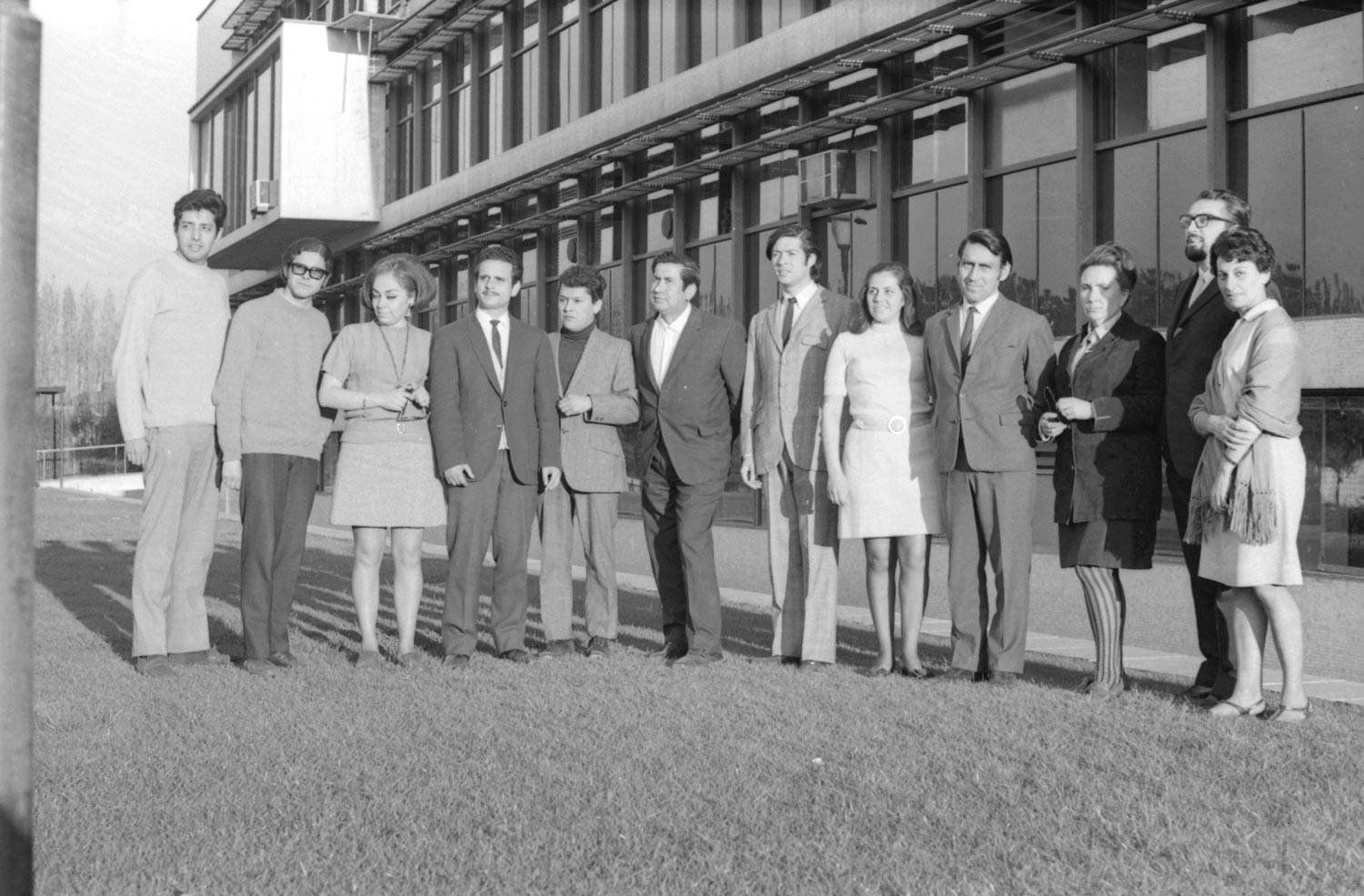 César Arredondo, Patricio Villanueva, Gladys del Río, Hugo Menanteau, Hugo González, Víctor Mix, Igor Cantillana, Gabriela Medina, Juan Quezada, María Asunción Requena, Raul Rivera y Maité Fernández en sesión fotográfica en los jardines de la Universidad Técnica del Estado previo a su gira por Bolivia en 1969. El grupo, invitado por el Ministerio de Cultura de ese país, viajó a La Paz donde presentaron las obras "Pan Caliente" de María Asunción Requena y "El Tragaluz" de Antonio Buero Vallejo.