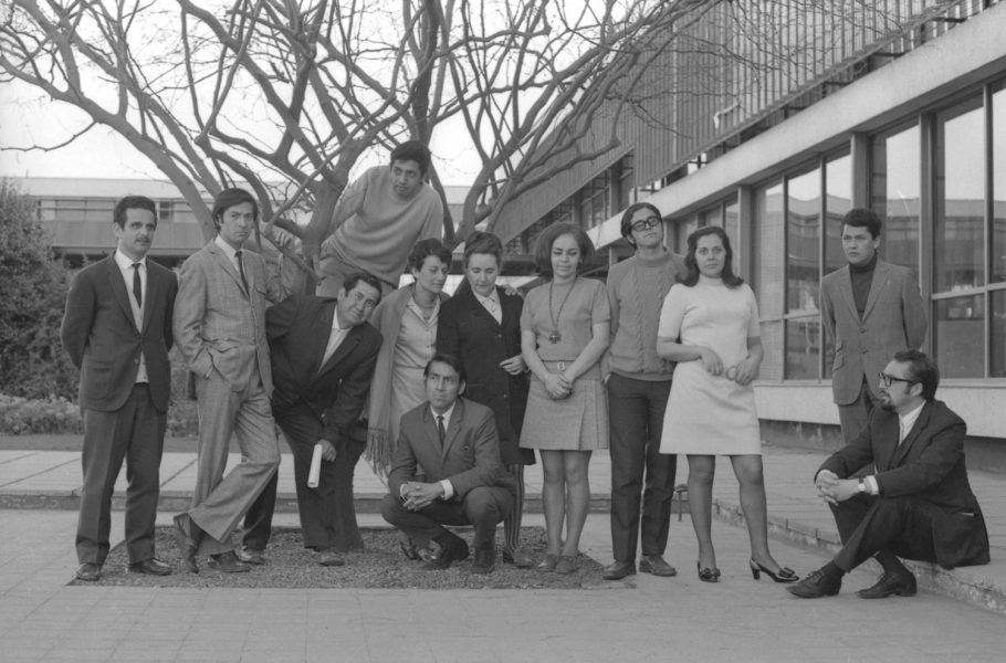 De izquierda a derecha, Hugo Menanteau, Igor Cantillana, Víctor Mix, César Arredondo (arriba), Maité Fernández, Juan Quezada (abajo), María Asunción Requena, Gladys del Río, Patricio Villanueva, Gabriela Medina, Hugo González y sentado, el director Raúl Rivera. La fotografía corresponde a una sesión previa a la gira por Bolivia en 1969. El grupo, invitado por el Ministerio de Cultura de ese país, viajó a La Paz donde presentaron las obras "Pan Caliente" de María Asunción Requena y "El Tragaluz" de Antonio Buero Vallejo.