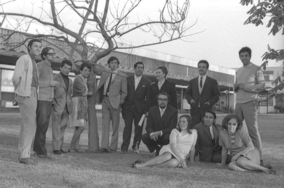 De pie: Mario Vallejos, Patricio Villanueva, Maité Fernández, Igor Cantillana, Víctor Mix, María Asunción Requena, Hugo Menanteau y César Arredondo. Sentados: Raúl Rivera, Gabriela Medina, Juan Quezada y Gladys del Río. La fotografía corresponde a una sesión fotográfica que se realizó antes del viaje del Teatro Teknos a Bolivia en 1969. El grupo, invitado por el Ministerio de Cultura de ese país, viajó a La Paz donde presentaron las obras "Pan Caliente" de María Asunción Requena y "El Tragaluz" de Antonio Buero Vallejo.