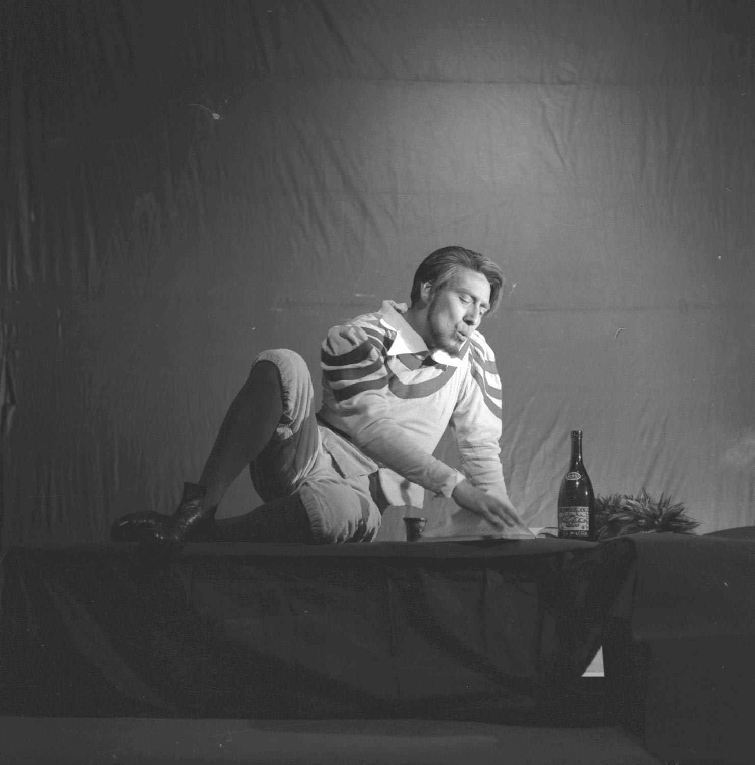 Juan Quezada en escena de la comedia en dos actos "Don Juan", del dramaturgo brasileño Guillermo Figueiredo. Bajo la dirección de Raúl Rivera, Teknos estrenó esta obra en 1965, sumándose a la labor de difusión del teatro latinoamericano que estaban desarrollando otros conjuntos teatrales nacionales.