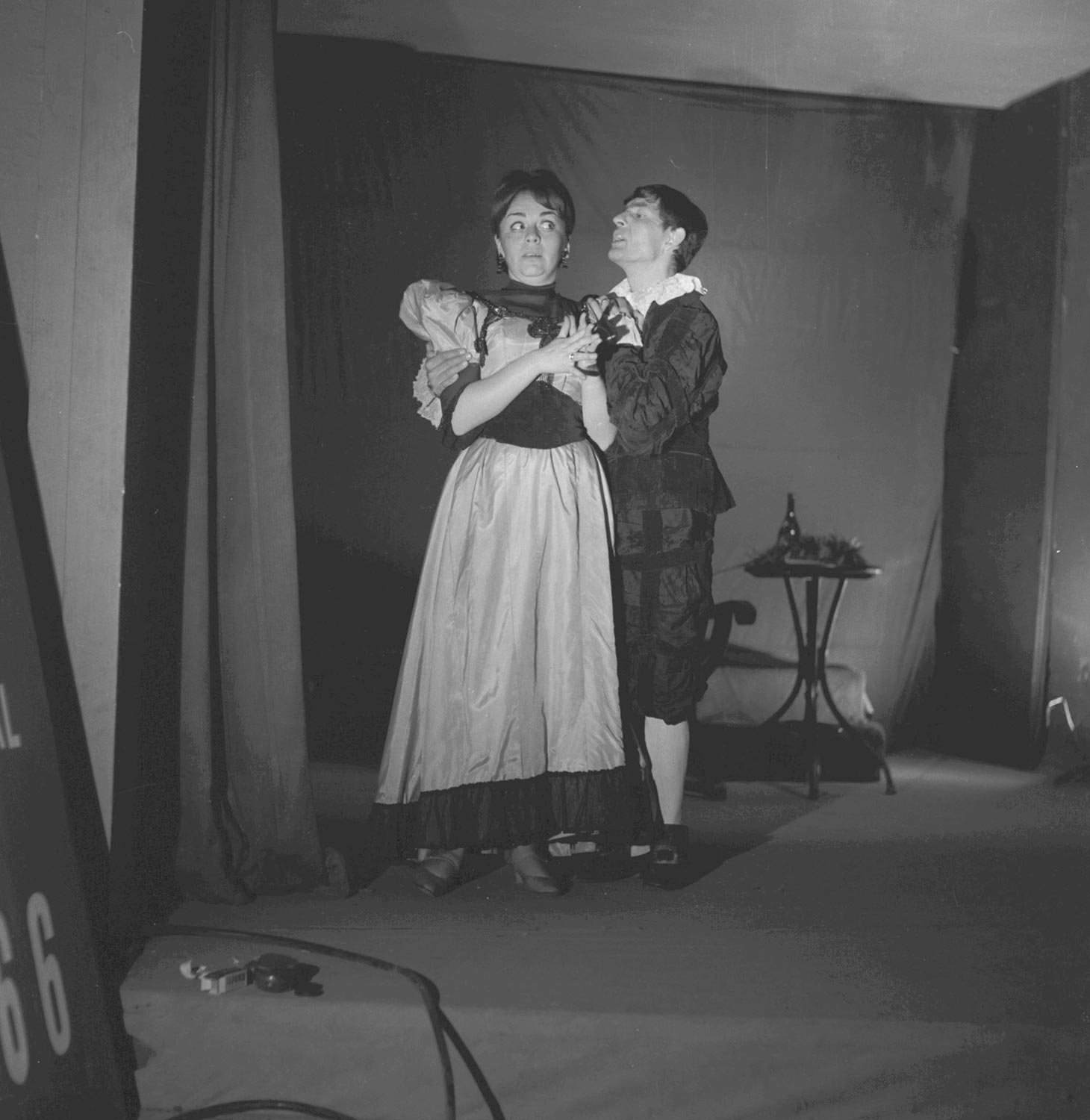 Oscar Ripoll y Gladys del Río en escena de la comedia en dos actos Don Juan, del dramaturgo brasileño Guillermo Figueiredo. Bajo la dirección de Raúl Rivera, Teknos estrenó esta obra en 1965, sumándose a la labor de difusión del teatro latinoamericano que estaban desarrollando otros conjuntos teatrales nacionales.