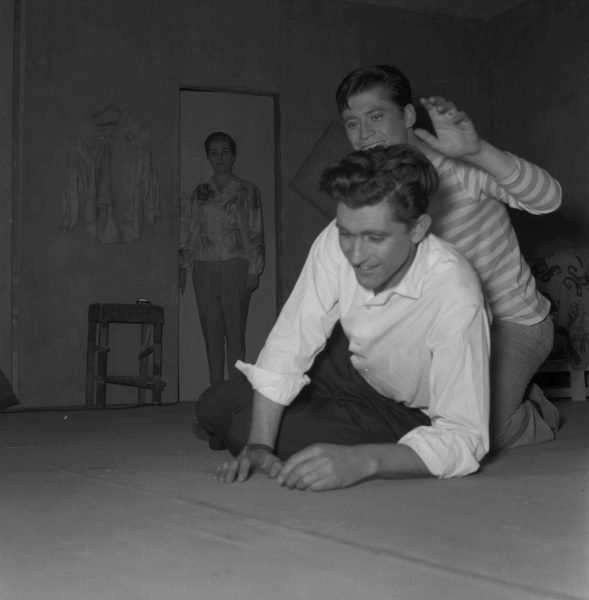 Escena de la obra "Los fugitivos" de Sergio Vodanovic, estrenada por el Teatro Teknos en 1965 bajo la dirección de Domingo Tessier como director invitado. Los personajes protagonistas fueron interpertados por Oscar Ripoll, actor del Teknos y Sonia Jara, actriz de la Casa de la Cultura de Ñuñoa.