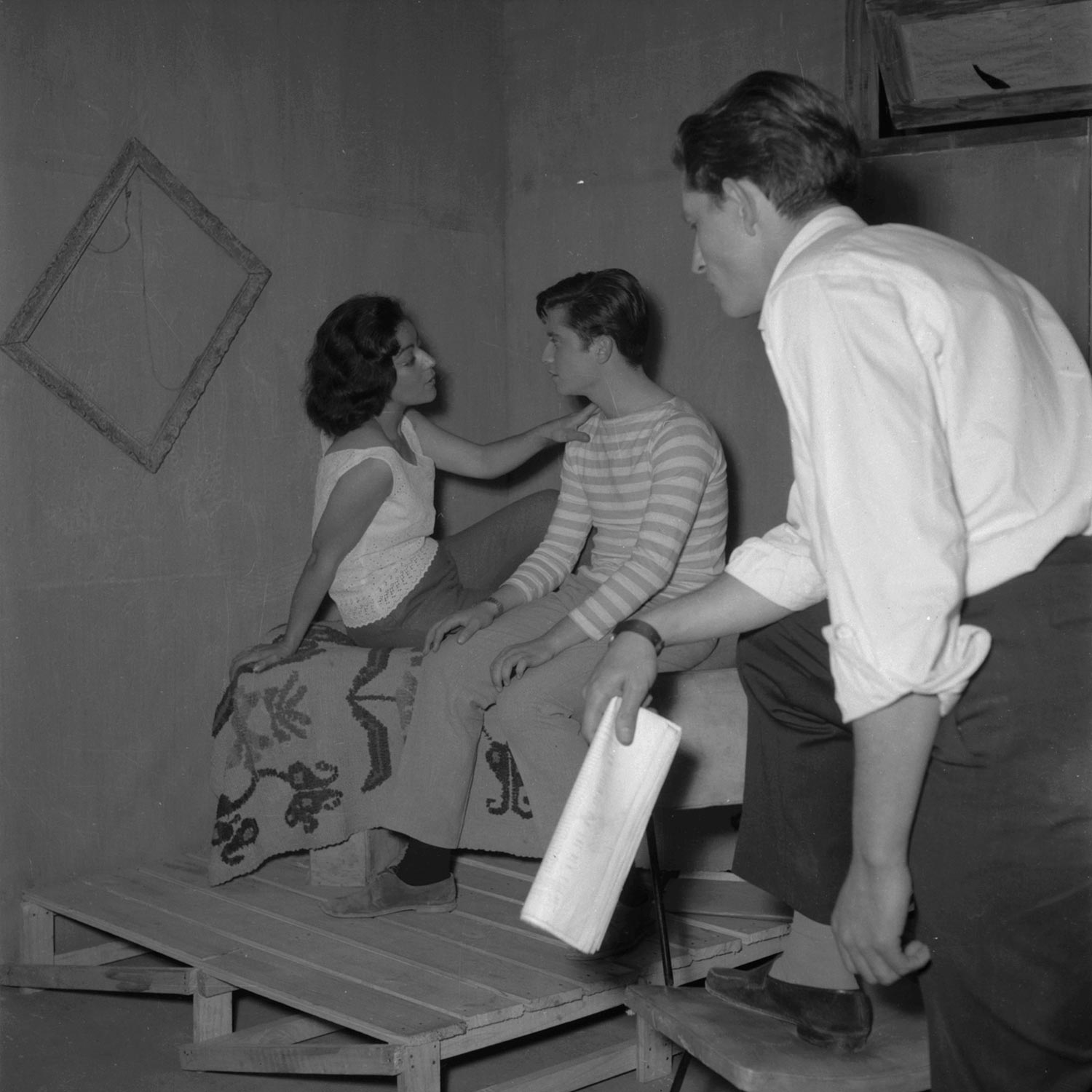 Escena de la obra "Los fugitivos" de Sergio Vodanovic, estrenada por el Teatro Teknos en 1965 bajo la dirección de Domingo Tessier como director invitado. Los personajes protagonistas fueron interpertados por Oscar Ripoll, actor del Teknos y Sonia Jara, actriz de la Casa de la Cultura de Ñuñoa.