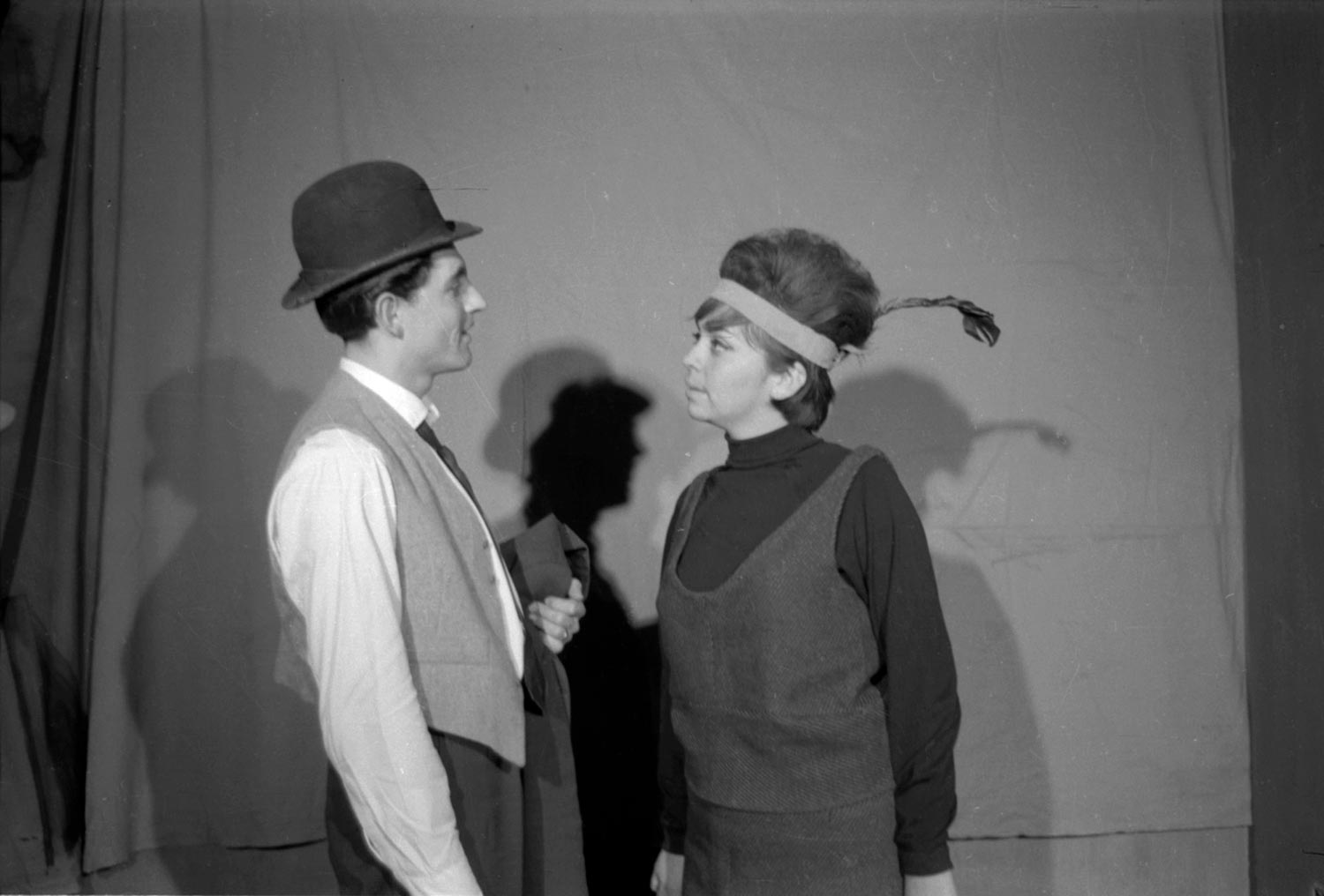 Oscar Ripoll y Gladys del Río en escena de la obra "Escape Libre" de Boutielle y Garcin, estrenada por el Teatro Teknos en 1966. A partir de este año, el grupo teatral comenzó a ampliarse, alcanzando diferentes ciudades, pueblos, poblaciones y escuelas.