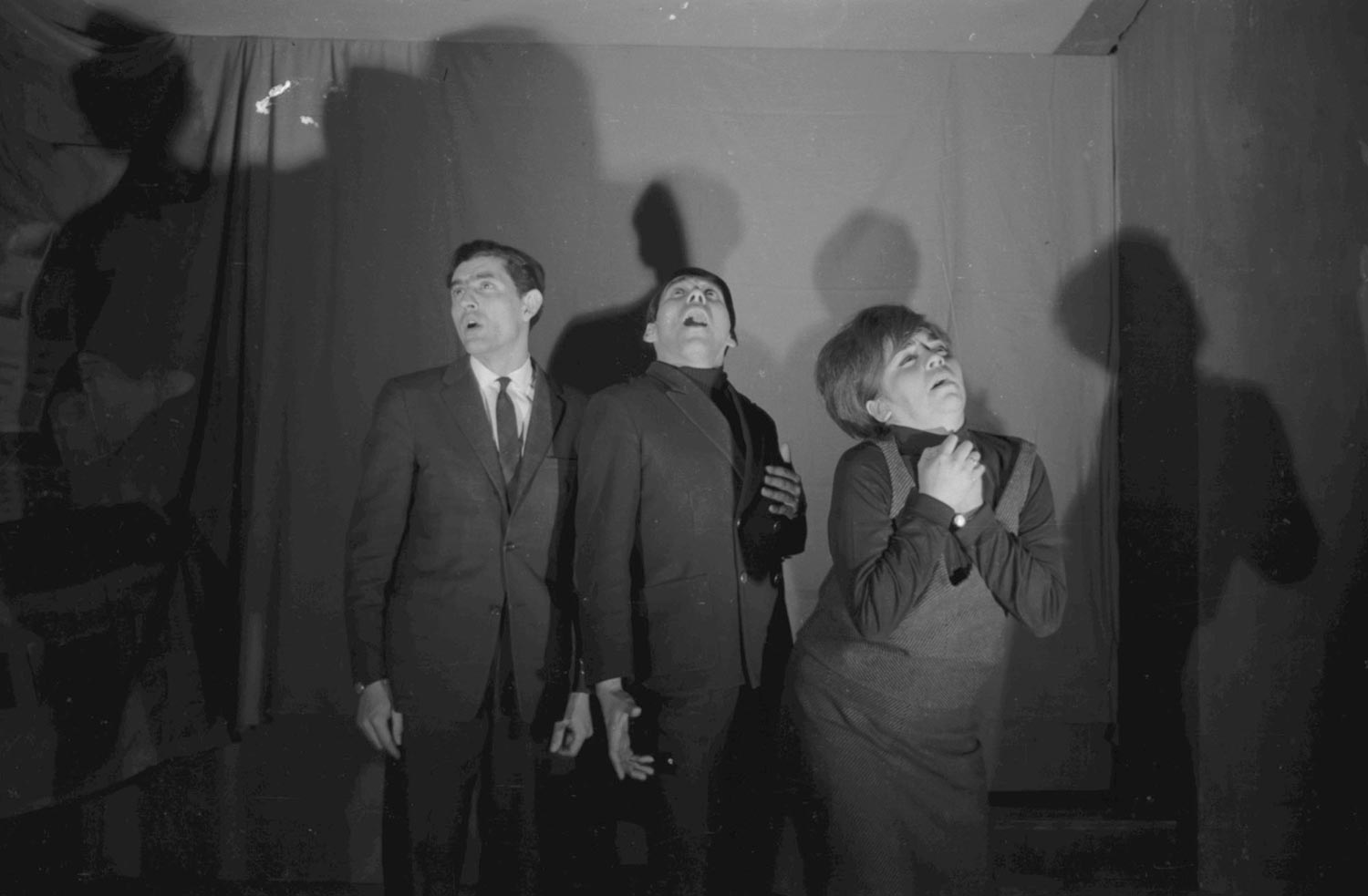 Oscar Ripoll, Juan Quezada y Gladys del Río en escena de la obra "Escape Libre" de Boutielle y Garcin, estrenada por el Teatro Teknos en 1966. A partir de este año, el grupo teatral comenzó a ampliarse, alcanzando diferentes ciudades, pueblos, poblaciones y escuelas.