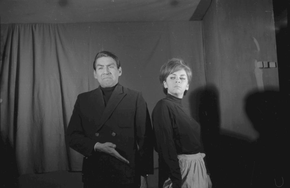 Juan Quezada y Gladys del Río en escena de la obra "Escape Libre" de Boutielle y Garcin, estrenada por el Teatro Teknos en 1966. A partir de este año, el grupo teatral comenzó a ampliarse, alcanzando diferentes ciudades, pueblos, poblaciones y escuelas.