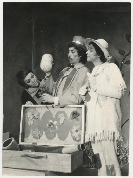 Gladys del Río, Adriano Castillo y Patricio Villanueva en escena de la obra infantil “Para saber y cantar” de Maité Fernández, estrenada por el Teknos en 1972.