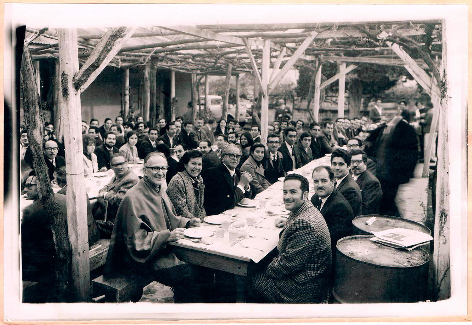 En la imagen destacan Enrique kirberg y Tomás Ireland. Kirberg asumió el 20 de agosto de 1968 como rector de la Universidad Técnica del Estado (UTE) siendo electo con mayoría universal y con participación de académicos y estudiantes. Fue desde el inicio reconocido como el rector de la reforma universitaria, impulsando importantes transformaciones junto a los estudiantes como la eliminación de la prueba de ingreso a la universidad, la creación de un nuevo Estatuto Orgánico que se consolidó en 1971, y la firma del Convenio CUT-UTE en 1969. A su vez Tomás Ireland fue estudiante de la Escuela de Ingenieros, miembro en sus inicios del Teatro Teknos y posteriormente Director del Departamento de Metalurgia de la Escuela de Ingenieros de la UTE, se desempeñó desde 1970 como Secretario General de la Universidad, siendo elegido para dichas tareas en las primeras elecciones democráticas para ese cargo que se dieron dentro de la reforma universitaria entre 1968 y 1973.