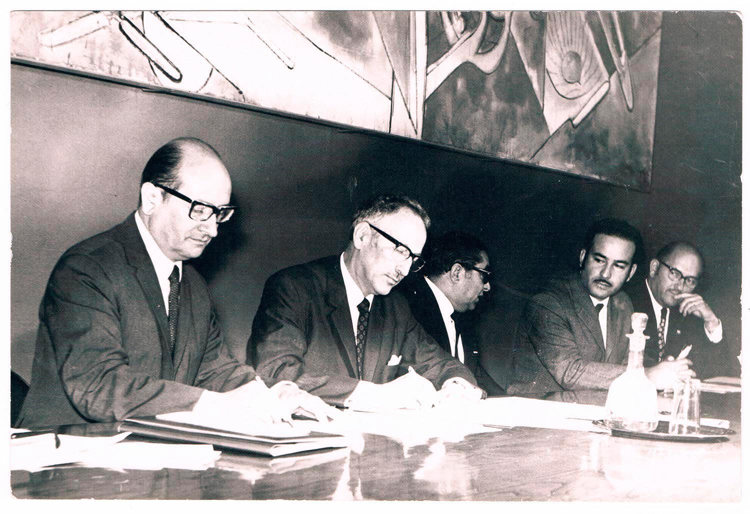 Firma del convenio con la Municipalidad de Santiago para la carrera de Ingenieria en Tránsito de la Universidad Técnica del Estado (UTE). En la imagen destacan el rector Enrique Kirberg, y el secretario general de la universidad Tomás Ireland. Durante la reforma universitaria se firmaron una importante cantidad de convenios, enfocados la gran mayoria en vincular a la universidad con la sociedad y con la clase trabajadora. Junto con ello se buscó generar un conocimiento real de la dinámica productiva del país y de las necesidades industriales, capacitando y formando a técnicos y profesionales requeridos para las tareas productivas del momento.