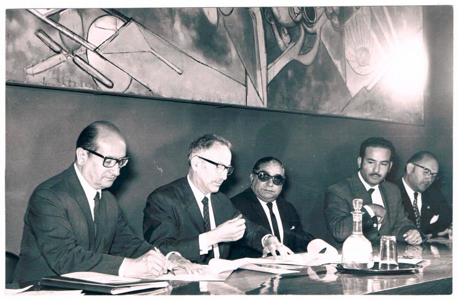 Firma del convenio con la Municipalidad de Santiago para la carrera de Ingenieria en Tránsito de la Universidad Técnica del Estado (UTE). En la imagen destacan el rector Enrique Kirberg, y el secretario general de la universidad Tomás Ireland. Durante la reforma universitaria se firmaron una importante cantidad de convenios, enfocados la gran mayoria en vincular a la universidad con la sociedad y con la clase trabajadora. Junto con ello se buscó generar un conocimiento real de la dinámica productiva del país y de las necesidades industriales, capacitando y formando a técnicos y profesionales requeridos para las tareas productivas del momento.
