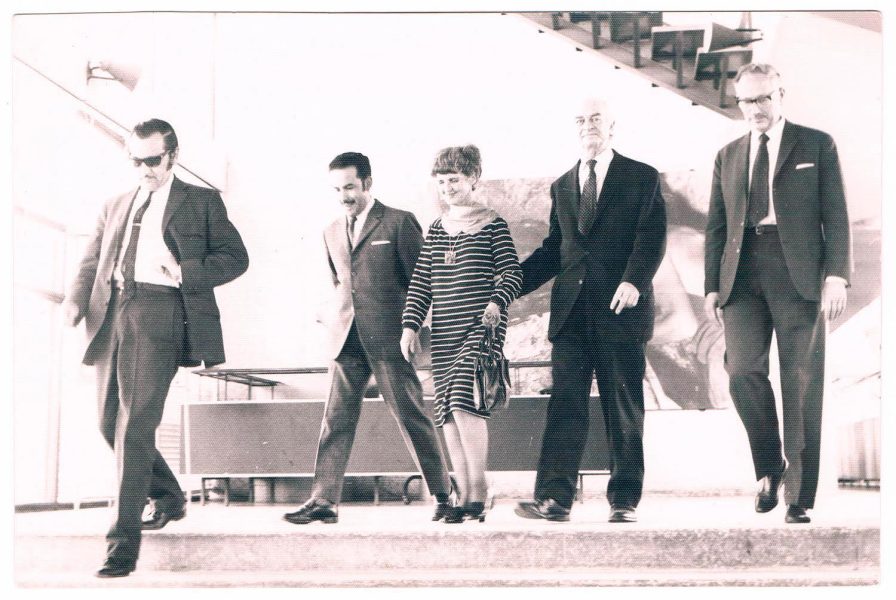 En la imagen Linus Pauling, Ava Helen, Enrique Kirberg y Tomás Ireland en la Casa Central de la UTE. Invitado por el rector Enrique Kirberg, el Dr. Linus Pauling visitó Chile el 24 de enero de 1970, para dictar una serie de conferencias en la Universidad Técnica del Estado. Gracias a sus importantes contribuciones a la ciencia, el científico norteamericano recibió en 1954 el Premio Nobel de Química; sin embargo, fue su ardua campaña en contra del uso de energía nuclear para fines bélicos, y contra la idea de llevar a cabo una guerra atómica, lo que le significó una nueva premiación por parte de la academia sueca, confiriéndole en 1962 el Premio Nobel de la Paz. El científico viajó acompañado de su esposa, Ava Helen, reconocida activista en el área de Derechos Humanos y Derechos de la mujer, quien participó de reuniones con diversas organizaciones femeninas del país. En su estancia en Chile, Linus Pauling recalcó la importancia de terminar con las guerras y la desigualdad en el mundo.