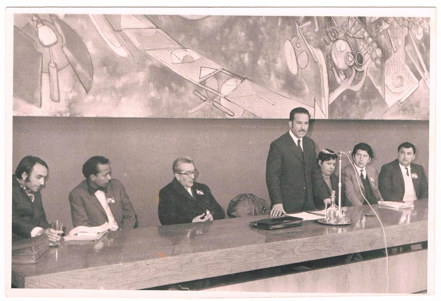 Conferencia en el Salón de honor de la Casa Central de la Universidad Técnica del Estado con motivo de la visita del presidente de la Unión Internacional de Estudiantes. En la imagen destacan Ruben Toro, académico de la Escuela de Ingenieros Industriales, y de pie hablando Tomás Ireland, secretario general de la universidad, electo en 1970 para este cargo.