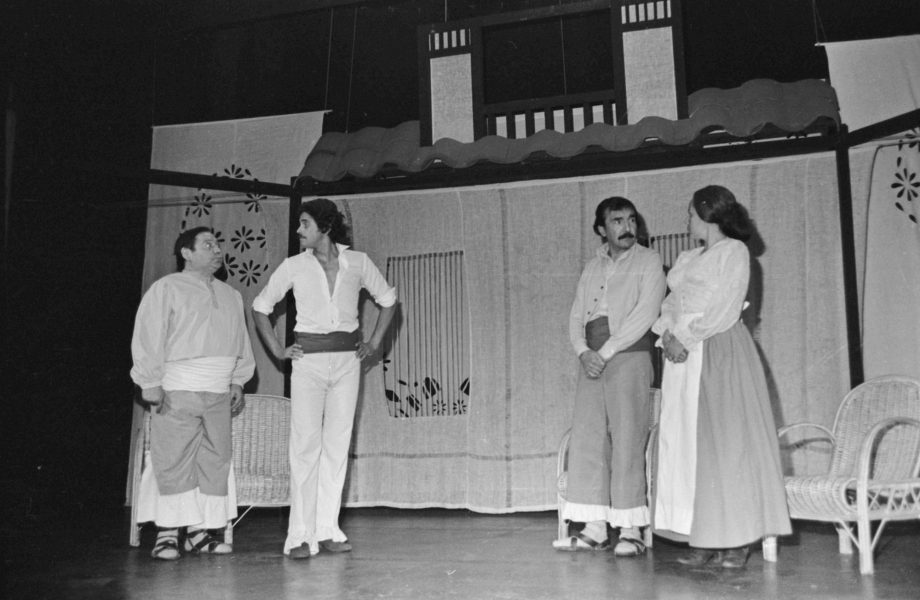 De izquierda a derecha: Jorge Boudon, Patricio Villanueva, Mario Montilles y Gabriela Medina en el montaje de la obra "La Fierecilla Domada". El sobre que almacenaba este negativo aparece fechado en 1976, sin embargo es posible que la fecha real sea 1975, correspondiente al año de estreno del montaje.